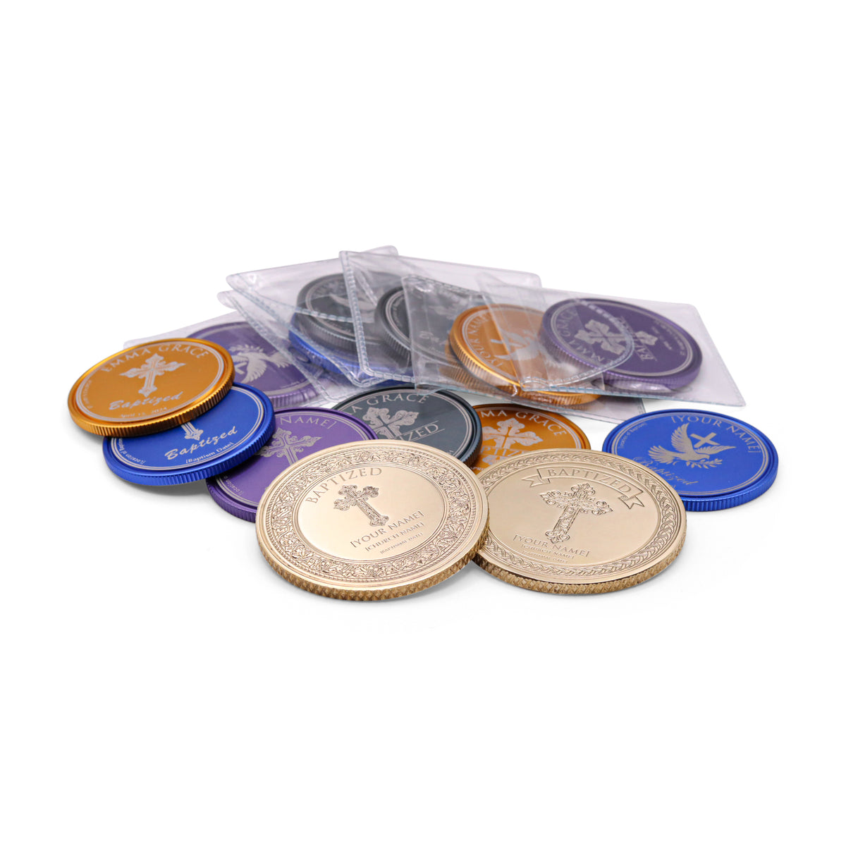 Commemorate any baptism—infant, child, or adult—with a beautifully personalized coin crafted from anodized aluminum or heirloom brass. Each coin is custom-engraved with the name, baptism date, and location of your choice, creating a one-of-a-kind keepsake for this spiritual milestone.